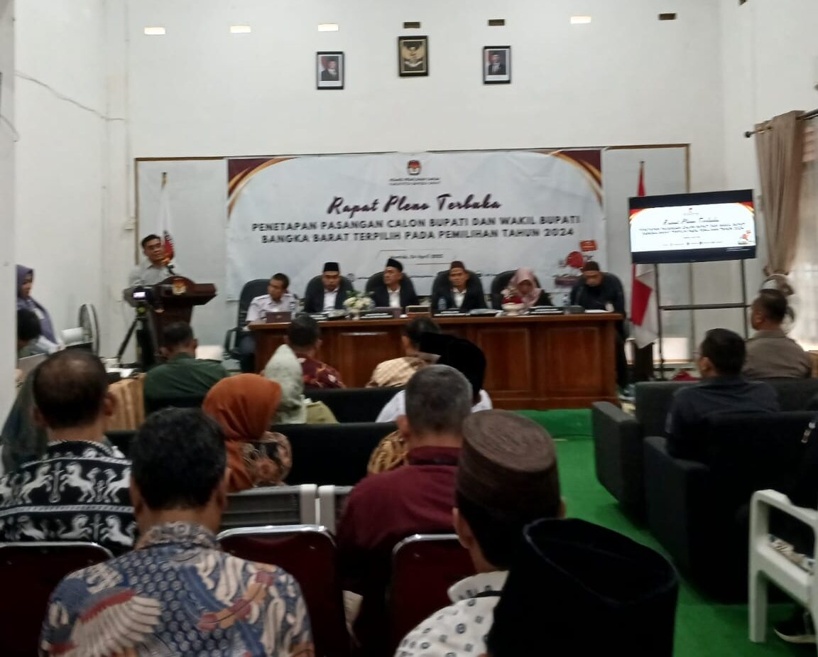 PILARRADIO.COM, MENTOK – Komisi Pemilihan Umum (KPU) Bangka Barat (Babar) menggelar Rapat Pleno Penetapan Bupati dan Wakil Bupati Bangka Barat Terpilih. Selain dihadiri Ketua dan Anggota KPU Bangka Barat, tampak hadir Wakil Bupati Terpilih H. Yus Derahman, Forkopimda Bangka Barat, Ketua KPU dan Bawaslu Provinsi, Media serta tamu undangan lainnya pada Kamis (24/4/2025).