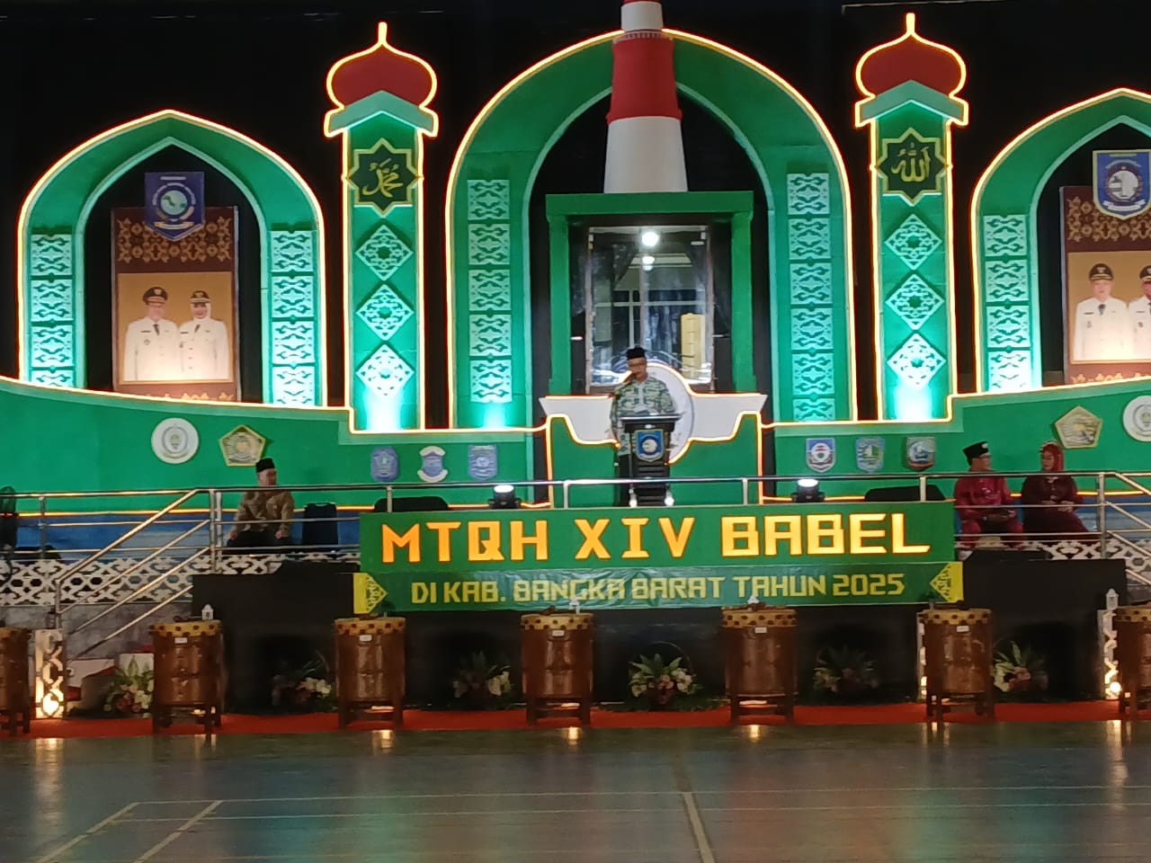 Gubernur Bangka Belitung yang diwakili Asisten Sekda Yunan Helmi, M.Si telah menutup Pekan MTQH XIV dengan dipukulnya bedug diikuti Bupati Bangka Barat Markus, SH diikuti pimpinan daerah dari Kabupaten/Kota di Provinsi Bangka Belitung di Sport Hall Bangka Barat pada Selasa, (11/11/2025) Malam