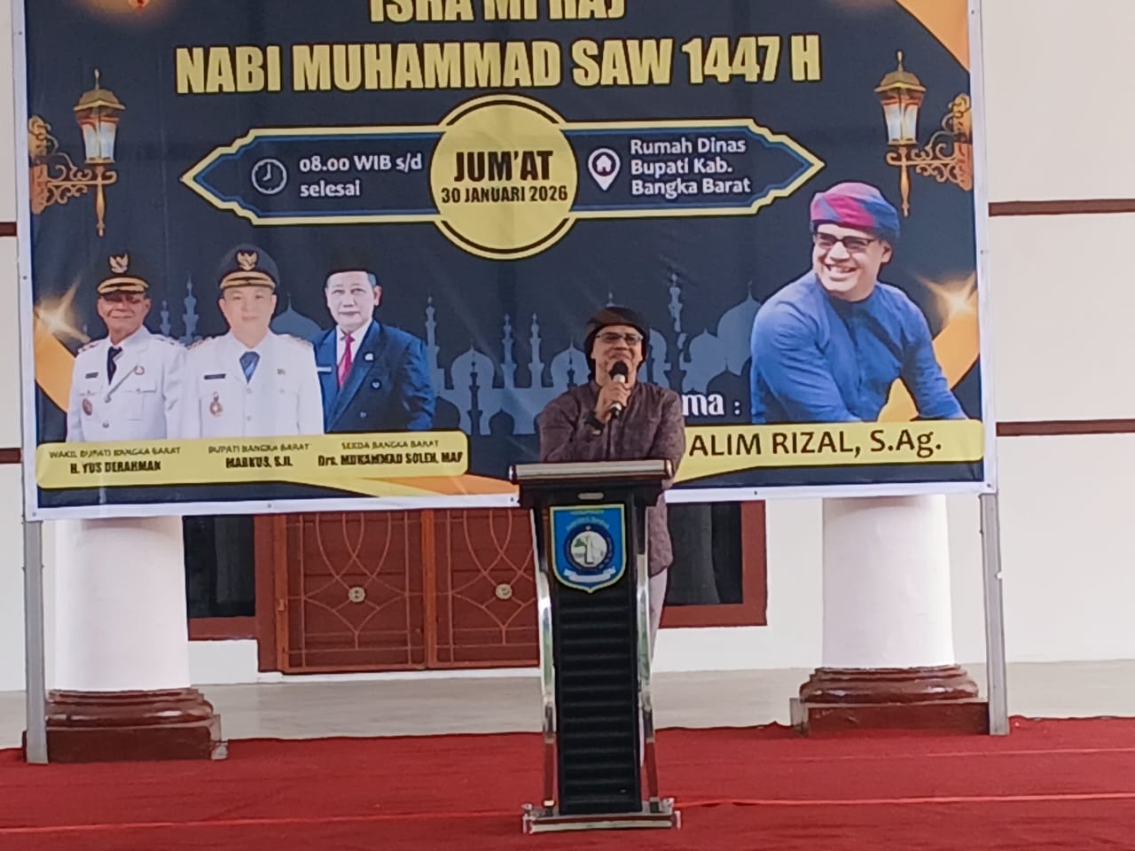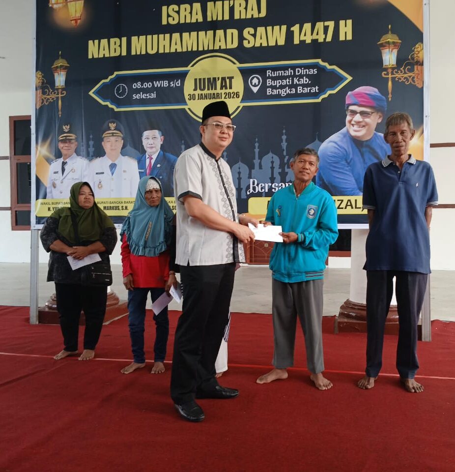 PILARRADIO.COM, MENTOK – Pemerintah Kabupaten (Pemkab) Bangka Barat menperingati Isra’ Mi’raj Nabi Muhamad SAW 1447 H. Peringatan Isra’Mi’raj diisi dengan mendengarkan ayat-ayat suci Al-Qur’an dan Tausiah yang disampaikan Mualim Rizal, S.Ag dan pemberian bantuan kepada dhu’afa, Jum’at, (30/1/2026).
