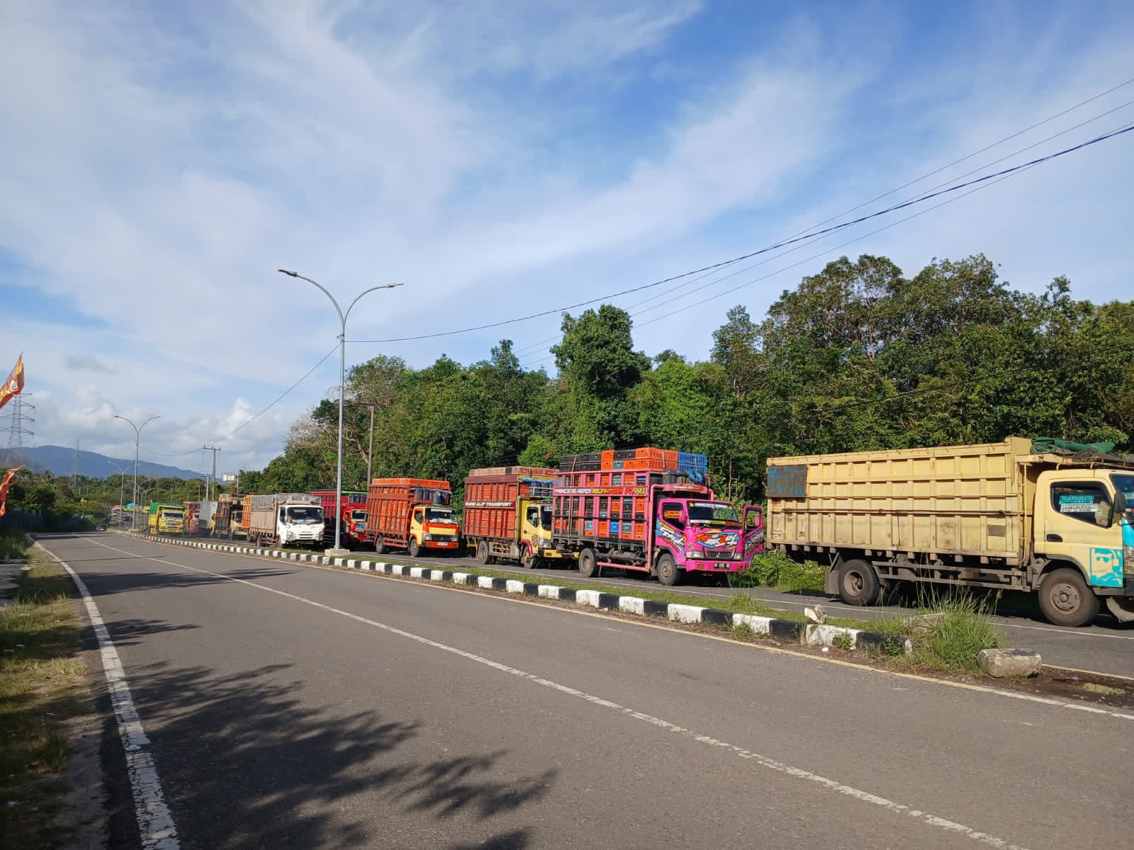 Sepanjang jalan ke pelabuhan puluhan truk mengantri menunggu jadwal keberangkatan mereka, Minggu (15/3/2026).